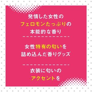 新製法エタノールフリーで女子○生のフェロモンが混ざった香り。思春期の想いを呼び覚ます匂いグッツ。女子○生とのすれ違いで制服の匂いを感じる。女性の特有の匂いを詰め込んだ香りで感覚が新たな次元へ。10mlの内容量で、吹き付けて時間が経つとリアルな匂いが楽しめる。専門家が真剣に製作した本物。取扱注意!