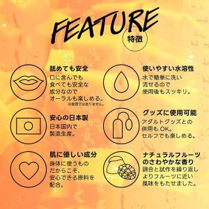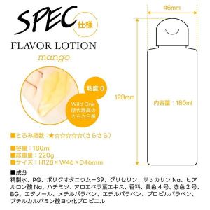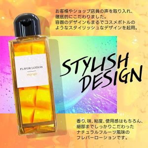 フルーティーな味と香りで新感覚プレイ! ワイルドワン女子が企画・開発した、女性のためのフレバーローション!安心安全の国内素材で、水のように「超さらさら」、フルーツみたいに美味しい水溶性ローションです!匂いが気になる日のフェムケアにも♪ナチュラルフルーツのさわやかな香りと風味の新開発フレバーローションです。粘度0.0という水のような「超さらさら」テクスチャをもたせ、最高級のスベりを実現しました。ベトつかないので、洗わずに拭き取れます!シンプルで透明感あふれる高級化粧品のようなボトルデザインで、もう置き場所にも困りません。「舐めて美味しい」「香りがいい」ことで、ラブタイムの幅がぐんと広がります。例えば…… ・「舌での愛撫は、刺激が強すぎる」という女性のために。 ・二人の時間をゆっくりと楽しむために。 ・デリケートゾーンの匂いが気になる日に。 ・口にふくんで温めておきやすいのも特長です。片手でも使いやすいワンタッチキャップ。気分がアガる全6種のフレバーで、自分自身がデザートになる感覚をお楽しみください。ヒアルロン酸、ハチミツ、アロエエキスを配合で、肌に優しい使い心地。。※ポリアクリル酸Na、シリコン、砂糖は使用していません。●マンゴー成分:精製水、PG、ポリクオタニウム-39、グリセリン、サッカリンNa、ヒアルロン酸Na、ハチミツ、アロエベラ葉エキス、香料、黄色4号、赤色2号、BG、エタノール、メチルパラベン、エチルパラベン、プロピルパラベン、ブチルカルバミン酸ヨウ化プロピニル■とろみ指数:★☆☆☆☆☆(さらさら)■容量:180ml■総重量:220g■サイズ:H128×W46×D46mm