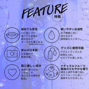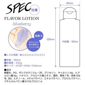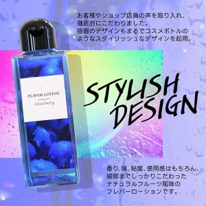 フルーティーな味と香りで新感覚プレイ! ワイルドワン女子が企画・開発した、女性のためのフレバーローション!安心安全の国内素材で、水のように「超さらさら」、フルーツみたいに美味しい水溶性ローションです!匂いが気になる日のフェムケアにも♪ナチュラルフルーツのさわやかな香りと風味の新開発フレバーローションです。粘度0.0という水のような「超さらさら」テクスチャをもたせ、最高級のスベりを実現しました。ベトつかないので、洗わずに拭き取れます!シンプルで透明感あふれる高級化粧品のようなボトルデザインで、もう置き場所にも困りません。「舐めて美味しい」「香りがいい」ことで、ラブタイムの幅がぐんと広がります。例えば…… ・「舌での愛撫は、刺激が強すぎる」という女性のために。 ・二人の時間をゆっくりと楽しむために。 ・デリケートゾーンの匂いが気になる日に。 ・口にふくんで温めておきやすいのも特長です。片手でも使いやすいワンタッチキャップ。気分がアガる全6種のフレバーで、自分自身がデザートになる感覚をお楽しみください。ヒアルロン酸、ハチミツ、アロエエキスを配合で、肌に優しい使い心地。※ポリアクリル酸Na、シリコン、砂糖は使用していません。●ブルーベリー成分:精製水、PG、ポリクオタニウム-39、グリセリン、サッカリンNa、ヒアルロン酸Na、ハチミツ、アロエベラ葉エキス、香料、青色1号、赤色106号、BG、エタノール、メチルパラベン、エチルパラベン、プロピルパラベン、ブチルカルバミン酸ヨウ化プロピニル■とろみ指数:★☆☆☆☆☆(さらさら)■容量:180ml■総重量:220g■サイズ:H128×W46×D46mm