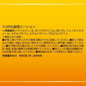 YUIRAより、使いやすいミニボトルサイズ(60ml)のローションが5種類一挙リリース量が多すぎる、持ち運びづらい、そんなアナタにピッタリの商品です!触るとじんわり温かな気分にさせてくれる温感(ホット)仕様!肌にやさしいグリセリンで、ねっとりした感触も楽しめます!良い感じの温かさで、更にヒートアップ間違いなしです。※安心安全の日本産商品です。<内容成分>グリセリン、水、ポリクオタニウム-39、PG、フェノキシエタノール、メチルパラベン、エチルパラベン、プロピルパラベン<使用上のご注意>・非常に滑りやすいのでご使用の際は十分に注意してください。・誤って飲み込んだ場合、お肌に合わない時はすぐに使用を中止し専門医に相談してください。・お子様の手の届かないところで保管してください。・直射日光のあたる場所、高温・多湿の環境での保管は避けてください。・目に入った場合は綺麗な水、又はお湯で洗い流してください。・開封後はなるべくお早めにご使用ください。<同時発売5種>YUIRAピュアローション60ml[日本製](品番:YIR030/JAN:4582588342063)保湿!潤滑性!ほど良い伸び!無色・無味・無臭中高粘度のスタンダードローションYUIRAオナホローション60ml[日本製](品番:YIR031/JAN:4582588342070)肌馴染みが良く、洗い流しも簡単♪ホール使用時のスタンダードモデルYUIRAア○ルローション60ml[日本製](品番:YIR032/JAN:4582588342087)ア○ル専用配合!ヒアルロン酸、コラーゲン入りでお肌にも優しい!アナニー時のスタンダードモデルYUIRAレディースローション60ml[日本製](品番:YIR033/JAN:4582588342094)アロエエキス、ハチミツ入り!植物原料をもとにしたナチュラルなレディース向けローションYUIRA温感ローション60ml[日本製](品番:YIR034/JAN:4582588342100)触るとじんわり温かな気分にさせてくれる温感(ホット)仕様