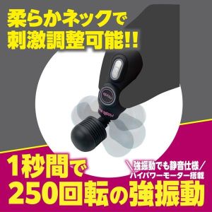1秒間で250回転の強振動モーターを搭載した小型デンマ。電源の長押しが必要ないクイックスタートタイプ。洗えるシリコンヘッドと10パターン振動、静音設計とカワイイ見た目に似合わない高性能。単四電池が2本付属していますので購入してすぐにご使用いただけます。