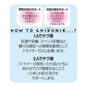 デリケートな乳首のために開発された潤滑ローション。格別なチクニーことチクオナのために研究を重ね、独自配合した成分で安心安全の快感をお約束。洗い流し不要、口に入れても安心で男女ともにご使用いただける一級乳首用ローションです。すりあわせて温めた清潔な手に適量を取り、円を描くように優しくマッサージすることで素手では味わえないハイグレードな快感を体感できます。ヒアルロン酸、ローズエキス、シルクエキス、シアバター、アルガンオイルを贅沢に配合。さらにアルギニンやシトルリンの効果で興奮度もサポートします。塗って興奮、舐めて興奮のWサポートで2にト同時にスペシャルな快感を味わいましょう!