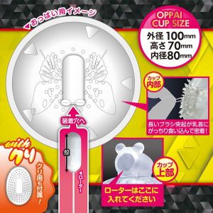 ローターが外せるからもっと自由に楽しめる!使い方はとっても簡単!!カップ上部分の穴にローターを入れ、おっぱいに吸着させるだけ!おっぱい全体をガッチリホールドできるおっぱい用カップ。内部のブラシ突起は乳輪&乳首をしっかり刺激!振動は悶絶必至の10パターン。好みのパターンでガンガン乳首イキしちゃおう。ク●用のカップも付属しているので3点責めもOK!!カップに装着せずそのままローターだけでも、1人でも2人でも責めても責められても存分に楽しめる乳首グッズです♪