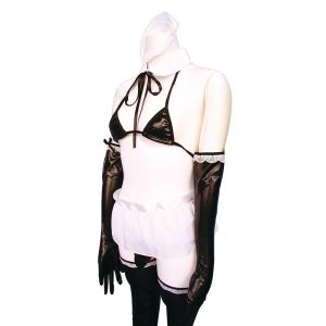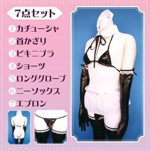 可愛らしさとセクシーさの融合!光沢感と肌見せがセクシーセクシーなメイドスタイルであなたがもっと魅力的にメイドの可愛さにセクシーをプラスあなたのファンタジーが現実に!7点セットカチューシャ、首かざり、ビキニブラ、ショーツ、ロンググローブ、ニーソックス、エプロンバスト 79~93cmヒップ 87~105cmFサイズポリエステル90% ポリレウレタン10%イラスト:ぺし太