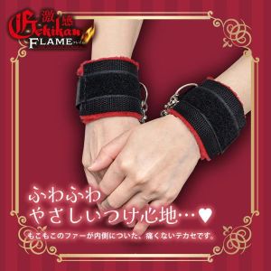 もこもこのファーが内側についた痛くないテカセ。マジックテープで留めるから、締め付けも調節可能。ファーの部分が重なっても留められるので、どなたの手首にも優しくフィットします。チェーンは付け替え自由。SM初心者のはじめての拘束プレイも安心なテカセです。