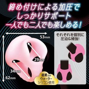 やわらかいシリコンリングがあるんだよ!全部で67mmで、20mmと28mmの2つの輪があるんだ。2つの輪を使ってホールドしっかりできるんだって。1人でもカップルでも使えるんだよ。Mサイズと一緒に使うと、すごくギンギンにできるんだって!使ったあとは洗剤で洗って水を拭いて、直射日光の当たらない場所で乾かして保管してね!