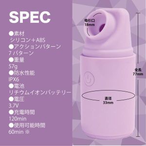 スタイリッシュな見た目で蓋付きだから持ち歩きにも便利な吸引ローター。上質なモーター搭載の吸引機構に高品質シリコン素材の吸引口と持ちやすいサイズ、さらにはIPX6の高レベル防水性能だからしっかり洗えて衛生的です。使用時は蓋を外して底面に付けられます。どこでもキャリー出来る自分だけのプレジャーアイテムです。3.7Vリチウムイオンバッテリー搭載で120分で満充電、最大60分の連続使用が可能です。(※使用環境により大幅に増減します。)多彩で実用的な7パターンの吸引を演出します。見た目と実用性を兼ね備えたMYPLEASUREGOODSです。