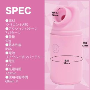 スタイリッシュな見た目で蓋付きだから持ち歩きにも便利な吸引ローター。上質なモーター搭載の吸引機構に高品質シリコン素材の吸引口と持ちやすいサイズ、さらにはIPX6の高レベル防水性能だからしっかり洗えて衛生的です。使用時は蓋を外して底面に付けられます。どこでもキャリー出来る自分だけのプレジャーアイテムです。3.7Vリチウムイオンバッテリー搭載で120分で満充電、最大60分の連続使用が可能です。(※使用環境により大幅に増減します。)多彩で実用的な7パターンの吸引を演出します。見た目と実用性を兼ね備えたMYPLEASUREGOODSです。