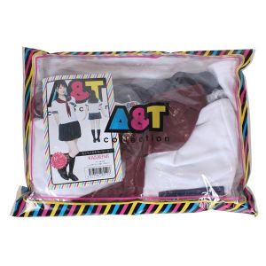 お洋服は、身体にピッタリフィットするストレッチ素材の身頃。短めのためガーリーで、セーラーカラーは曲線を描いて、あの昔を思い出させる。淡いピンクのチェックで、可愛らしさ倍増。スカートは、マジックテープで留めるラップタイプ。ネクタイも長さを調整でき、とっても便利!