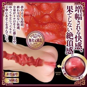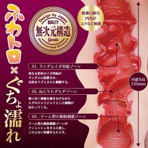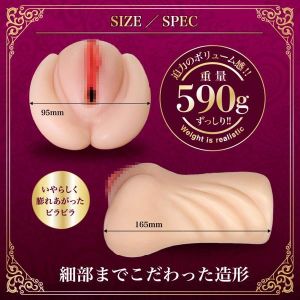 究極コラボ、ふわトロ×ぐちょ濡れ名器を迫力のボリューム感の600gでずっしり仕上げました。いやらしく膨れ上がったビラビラから侵入すると、ランダムイボの突起が刺激しねじりヒダが吸い付く様な感触とジョリジョリした刺激をプラスしてくれます。ドーム型の最奥部ではフィニッシュを促す快感を。80mlの本気汁ボトルローションも付属していますのでぐちょ濡れを大いに体験してください。
