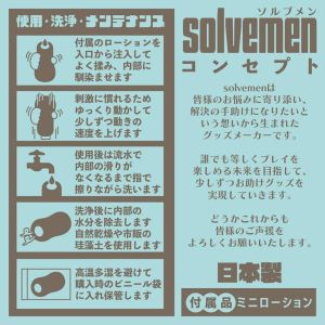 ソルブメンはあなたのお悩みを解決する存在です。「カ〇を攻められるのがとにかく好きなんだ」「根〇を締め付けられるのがたまらなくイイ」個人の好みによってGOODポイントは異なります。そんな個性に全力で応えたいです。それがソルブメンの生まれた意味だと思いませんか?もっちり刺激のアウターで確かな包まれ感をお約束。その上で、ピンポイントでアナタの敏感な部分をアタック!オナホールの可能性を感じてください。これは性癖に応えた正統進化と言っても過言ではありません。あなたはオナホ選びに悩む必要はなくなります。あなたのためにソルブメンがいるのです。安心安全の日本製で繰り返し何度でも利用が可能です。