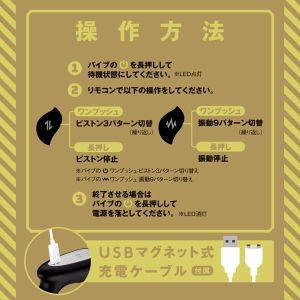 超パワフルなバイブが登場!ピストンで気持ちいい刺激をたくさん感じられるよ!最高の快感を味わってね!充電時間は約110分、連続使用時間は約45分だよ。IPX7等級で水にも浸けられちゃうし、リモコンもついてるよ。いろんな遊び方を試して、新しい快感を見つけてね!