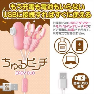 電池のいらないEASYDUOシリーズから吸引とピンチのダブルタイプの登場。2つのピンチにモーターが搭載されており12モードのアクション振動、吸引部もピンチの先端部分にもシリコンカパーが付いているのでどちらも優しく包みこんでくれます。持っているモバイルバッテリーやUSBアダプターから給電出来るため、使用場所を選びません。本体重量76gと超軽量の為、上下同時に使用頂けます。※パッケージのデザイン・サイズは予告なく変更される可能性がございます。※商品破損、部品不足等の初期不良品については、パッケージ等に記載されているメーカーのサポートセンターにご連絡ください。記載されていない場合は、当社までお問い合わせください。