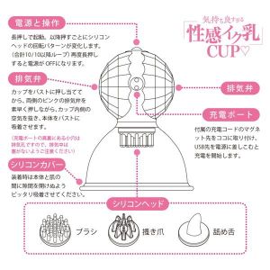 「乳感」と「育乳」のためのバスト専用SEXYグッズ。2つの育(イク)乳カップがバストに吸い付き、カップ内のブラシヘッドが回転しながら乳首を舐めまわします!【使い方】はじめにカップ内にお好みのシリコンヘッドを取り付け、ヘッドの先端にローション等の潤滑剤を塗布します。次にカップをバストに押し当て、両側のピンクの排気弁を素早く押しながら本体をバストに吸着させます。吸着したら、電源スイッチを長押し起動。以降軽くおすたびにヘッドの回転パターンが変化します。 (全10回転。10を越えるとループ)終了するには、再度電源スイッチを長押して停止させ、最後に本体をバストから取り外してください。■付属シリコンヘッド:3種(ブラシ/き爪/舐め舌) ■ヘッドのアクション:10種類回転■本体材質:シリコン+ABS■付属品:充電コード■充電時間:50分マグネット先を本体下の充電ポートへ/USB先を電源へつなぐと電源スイッチが点滅。点滅が点灯に変わったら満電。■連続使用時間(満電時):60分使用後、本体は水気を含んだ布で内外を拭き取り、仕上げに乾いた布水気をよく拭取った後、お子様の手の届かない風通しのよい場所で付属品と一緒に保管してください。※金属部の水気は特によく拭き取ってください。※パッケージのデザイン・サイズは予告なく変更される可能性がございます。※商品破損、部品不足等の初期不良品については、パッケージ等に記載されているメーカーのサポートセンターにご連絡ください。記載されていない場合は、当社までお問い合わせください。