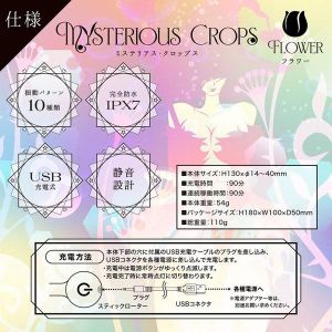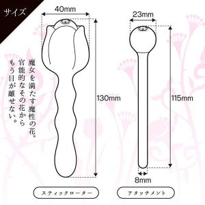 ■商品サイズ:縦130×φ14~40mmそれは、魔女の淫欲さえ満たす魔性の花々。花園に迷い込んだあなたは、官能的なその花からもう目が離せない。魔女の花園で咲き誇る、この世のものではない妖しい花々。それは女性の秘めた欲望を刺激し、優しく満たす官能的な秘具でした――。『ミステリアス・クロップス』は着脱可能なアタッチメントとシンプルなスティックローターがセットになったお手軽バイブ。アタッチメントを外せばピンポイント振動刺激に適した金属製のローターとして。アタッチメントを着ければ気軽に中イキを楽しめる細身のバイブとして。2つの用途を使い分けることで、1本で幅広い快感を味わえます。しかもローターが共通サイズなので、「ステム」「フラワー」「ミセリウム」の3種類でアタッチメントを相互に付け替え可能。色違いのパーツを自分好みに組み合わせてみましょう!気になる振動パターンは全10種類。ワンボタン切り替え式なので使用中の操作にも迷いません。さらに完全防水(IPX7)相当の防水性能を備えているので、お風呂での使用や丸洗いもOK!もちろん潮吹きで濡れても故障の心配はありません。USB充電式なので煩わしい電池交換の手間もなく、手軽さはピカイチです!静音設計なので使用中の動作音も気にならず、こっそり楽しみたいときも活躍してくれるかも。一見しただけではアダルトグッズに見えないフォルムはカモフラージュ性能もバツグン。「エッチなことはしたいけど、エッチなことをしているとは思われたくない」……そんな欲望を秘めた貴女にこそ、神秘的な魔女の秘具が力になるでしょう。●フラワー優雅に咲き誇る「花」を模したアタッチメント。曲線的なフォルムが挿入をサポートし、負担を減らします。サイズ:H130×φ14~40mm重量:54g総重量:110g●防水レベル:IPX7(完全防水)●箱サイズ:H180×W100×D50mm●付属品:充電用プラグ式USBケーブル(電源側:Type-A)、取扱説明書※パッケージのデザイン・サイズは予告なく変更される可能性がございます。※商品破損、部品不足等の初期不良品については、パッケージ等に記載されているメーカーのサポートセンターにご連絡ください。記載されていない場合は、当社までお問い合わせください。