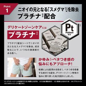 プラチナ配合の男性デリケートゾーン用ウェットシート。ニオイの原因となるスメグマ(皮脂や汗、古い角質などの汚れ=恥垢のこと)を除去し、ライジング成分(アルギニン、シトルリン等)で男性活力もサポート。やわらかい不織布で低刺激設計、トイレに流せるため使用がバレにくく、行為前のスマートなケアを可能にした男性専用アイテムです。※パッケージのデザイン・サイズは予告なく変更される可能性がございます。※商品破損、部品不足等の初期不良品については、パッケージ等に記載されているメーカーのサポートセンターにご連絡ください。記載されていない場合は、当社までお問い合わせください。