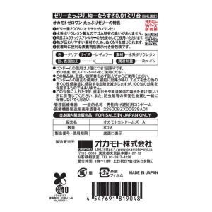 ■商品サイズ:3×55×59オカモト史上最薄で、均一な厚さ0.01ミリ台のコンドーム8個入製品です。新配合により柔らかくしなやかな水系ポリウレタン製コンドームに仕上げました。スタンダード品と比べ潤滑ゼリーの量をたっぷり入れています。ゴム特有の匂いが無く天然ゴムラテックスアレルギーの方も安心してご使用いただけます。装着時に便利な表裏判別表示付き個包装です。※パッケージのデザイン・サイズは予告なく変更される可能性がございます。※商品破損、部品不足等の初期不良品については、パッケージ等に記載されているメーカーのサポートセンターにご連絡ください。記載されていない場合は、当社までお問い合わせください。