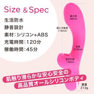■商品サイズ:全長219mm、挿入可能長116mm、最大径38mm中イキと外イキ、どっちもしっかり楽しめる!中責め振動快感とチュパチュパ吸引快感が同時に楽しめる噂の吸引バイブがアクション操作のしやすいスティックタイプになりました。滑らかで心地良い肌触りの高品質なオールシリコンボディに挿入しやすいのにしっかりと満たされる絶妙なデザインとサイズ感をプロダクト!振動用と吸引用に高性能なモーターを2機搭載!共に10種類の実用性の高いパターンをプログラムしています。リチウムイオンバッテリー充電式で120分の充電で最大45分の連続使用が可能(使用環境により大幅に増減します)使いやすくて気持ち良いバイブです。※パッケージのデザイン・サイズは予告なく変更される可能性がございます。※商品破損、部品不足等の初期不良品については、パッケージ等に記載されているメーカーのサポートセンターにご連絡ください。記載されていない場合は、当社までお問い合わせください。
