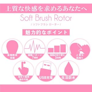 ■商品サイズ:全長132 最大幅23SoftBrushRotorは柔かなブラシ状の先端が細かく震え優しい刺激を与えます。7種の振動パターンに加え、強弱を3段階で変更できるので、自分に合った刺激を調節できます。先端部分は吸盤で接続されているので、取り外しや角度の調整が可能。ワンボタンで操作可能なシンプル仕様です。充電式なので使う場所を選びません。生活防水なので安心して使え、使用後は洗浄し清潔に保てます。※パッケージのデザイン・サイズは予告なく変更される可能性がございます。※商品破損、部品不足等の初期不良品については、パッケージ等に記載されているメーカーのサポートセンターにご連絡ください。記載されていない場合は、当社までお問い合わせください。