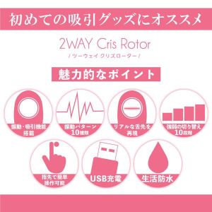 ■商品サイズ:全長90 最大幅232WAYCrisRotorは舌先のような振動と唇の様な吸引、2つの良いところを併せ持ったローターです。それぞれ10パターンの動作を切り替え可能。舌側は高速で上下する舌先がときに優しく、ときに激しく快感ポイントを刺激します。吸引側は吸い付きながらブルブルとした振動も楽しめる2段刺激です。舌側・吸引側それぞれがワンボタンで操作可能なシンプル仕様。生活防水なので安心して使え、使用後は洗浄し清潔に保てます。※パッケージのデザイン・サイズは予告なく変更される可能性がございます。※商品破損、部品不足等の初期不良品については、パッケージ等に記載されているメーカーのサポートセンターにご連絡ください。記載されていない場合は、当社までお問い合わせください。