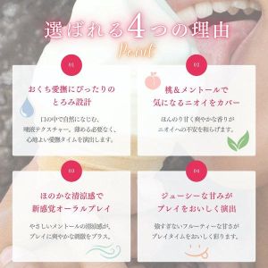 甘さと爽快感が調和する、とろりなめらかローション’とろり×やさしい甘さ’を楽しめる、新感覚のオーラルプレイ用ローション。ほんのり甘い桃とメントールの爽やかさを添え、フルーティで心地よい香りとなめらかなとろみが口の中に優しく広がります。弁付きキャップで、ワンプッシュで適量をスムーズに吐出、お口にダイレクトイン!なじみやすい自然なとろみの’唾液テクスチャー’で、薄める必要なくそのままプレイに使えます。オーラルプレイが苦手な方、口臭や匂いが気になる方にもオススメです。※パッケージのデザイン・サイズは予告なく変更される可能性がございます。※商品破損、部品不足等の初期不良品については、パッケージ等に記載されているメーカーのサポートセンターにご連絡ください。記載されていない場合は、当社までお問い合わせください。