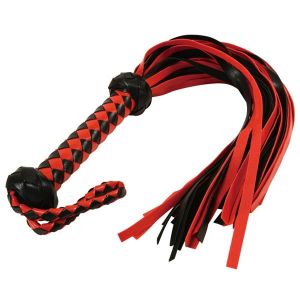 このウィップ、見た目がカッコイイ赤と黒の色で、合成皮革で作ってあるよ!編み目もしっかりしてて、高級感があってグッド!