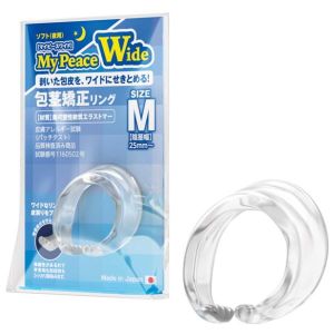 「マイピースワイド」は男性の悩みである仮性包○を解決する商品。包皮を剥いて、ワンタッチ装着で徐々に剥きグセを付け、清潔さを維持。リング幅を3倍にしたC型リングはズレにくく、皮膚アレルギー試験済みの安心素材で作られている。無色透明なクリア素材でバレにくく、就寝時にはソフトタイプ(夜用)がオススメ。使用後は清潔にし、直射日光や高温多湿を避けて冷暗所に保管すること。