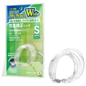 「マイピースワイド」は男性の悩みである仮性包○を解決する商品。包皮を剥いて、ワンタッチ装着で徐々に剥きグセを付け、清潔さを維持。リング幅を3倍にしたC型リングはズレにくく、皮膚アレルギー試験済みの安心素材で作られている。無色透明なクリア素材でバレにくく、就寝時にはソフトタイプ(夜用)がオススメ。使用後は清潔にし、直射日光や高温多湿を避けて冷暗所に保管すること。