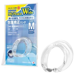 「マイピースワイド」は男性の悩みである仮性包○を解決する商品。包皮を剥いて、ワンタッチ装着で徐々に剥きグセを付け、清潔さを維持。リング幅を3倍にしたC型リングはズレにくく、皮膚アレルギー試験済みの安心素材で作られている。無色透明なクリア素材でバレにくく、就寝時にはソフトタイプ(夜用)がオススメ。使用後は清潔にし、直射日光や高温多湿を避けて冷暗所に保管すること。