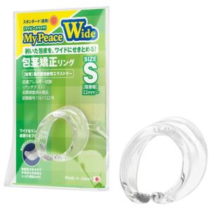 「マイピースワイド」は男性の悩みである仮性包○を解決する商品。包皮を剥いて、ワンタッチ装着で徐々に剥きグセを付け、清潔さを維持。リング幅を3倍にしたC型リングはズレにくく、皮膚アレルギー試験済みの安心素材で作られている。無色透明なクリア素材でバレにくく、就寝時にはソフトタイプ(夜用)がオススメ。使用後は清潔にし、直射日光や高温多湿を避けて冷暗所に保管すること。