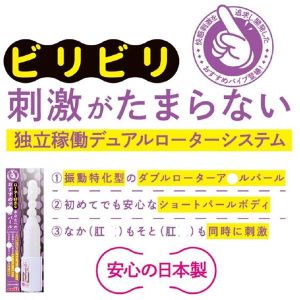 ぶるぶるビリビリ!あなたにオススメのア●ルバイブできたよ!『デュアルローターシステム』搭載で最高の振動が味わえる!パール先端と根●部分にマイクロローターを内蔵して、中と外を同時に刺激♪2個のローターは強弱コントロール可。パール直径16.5mmで初心者でも簡単に楽しめるよ。日本製で単4電池×3本(付属)使うんだよ♪