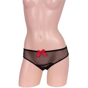 うわぁ〜!ぜ〜んぶブラックのメッシュで私、イヤラシくなりちゃったわぁ〜!そう、この「斬新ブラックメッシュフルバック」って商品よ!このパンツ、おしりギリギリまで隙間があるんだから、もうそこがとってもセクシーなんだよね〜♡股間のところにはお花のレース生地があって、ひじきのようなすごく存在感があるの♪そんなにギュッと締め付けられないから、動きやすくて履いていて気持ちがいいの。可愛い赤いリボンも付いていて、レースとの対比がまたたまらないんだよね〜!どうせなら、このパンツでモテまくっちゃってください♡