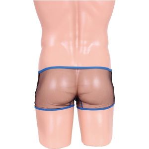 このトランクス、伸縮性のあるネット生地で作られているんだ。だから、おしりや脚にピッタリフィットして、とっても快適なんだね!それに、ブルーのパイピングがお洒落で、いいアクセントになっているんだよ〜。ね、可愛くてオシャレでしょ?