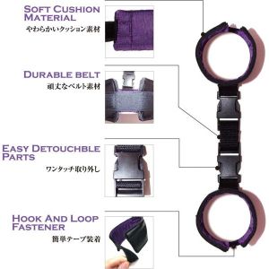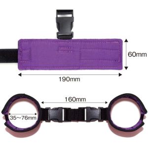 手枷は、マジックテープで自由にサイズ調整ができるから、どんな体型でもぴったりフィット。しかも、パーツの着脱は、ワンタッチで簡単だから、不慣れでも安心。手枷と足枷、M字開脚などを組み合わせることで、プレイの幅を広げられるの。そして、素肌に触れる内側には、高級感あふれる紫色のファブリック素材と、たっぷりのクッションが使用されているから、着け心地が抜群なんだよ。