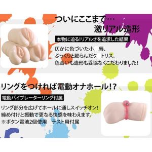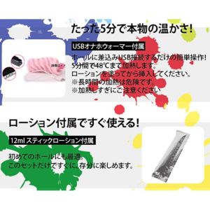 「すごいよーー♡ 小さな口まで作って、たくさんの小さなボコボコもついたの! お色もすごくリアルだよ!ヒートスティックはUSBにつなぐだけで、5分で48℃になるの! そしたら人肌みたいな感じがして思わずトキメキちゃうの♡ それに、リングローターっていう電動もついてるから、もっと気持ちいいの!すっごいセットだね!」ホール/USBヒートスティック/リングローター/ローション12mlが付くよ♪