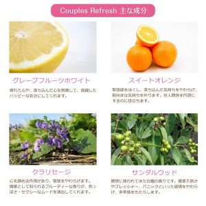 「セックスしたいな~」と思えるタントラアロマ。マンネリ解消にも。『Make Love for Couples Refresh』は、日本人に親しい柑橘アロマに、オリエンタルな香りをブレンド。香りの効果で、欲求もたやすく目覚めます。枕に1滴垂らすだけ、ルームウェアなどに使用も◎。注意点として、原液は皮膚に使用しないこと。万一目に入っても、大量の水で洗って。保管は、子供の手の届かない冷暗所に。 化粧品・医薬品ではないので、火気にもご注意を。