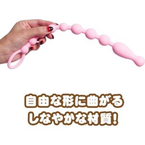 かがやく女性のもとへ、アムールブリエからア○ルの商品が出たよ!ドーナツみたいな可愛い形が、お○りにぴったりでしょ!シリコンで作られた可動式のビーズが10個ついて、全長は34cm。一番先っぽは2cmと2.6cmのビーズ、その後ろには直径2.2cmのビーズが3つつながって、最後には直径1.6cmのビーズが5つもぶら下がっているのよ!