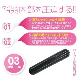 お姉ちゃん!このちっこいのめっちゃパワフルだよ!すんなり入っちゃうから初めての人にもおすすめ。根元が太くて広がるから気持ちいいし、先っぽがカーブしてるからたくさん感じられるんだ!それにローターONで超キモチイイよ!電池は一本ついてるけど、シートは外さないでね♪