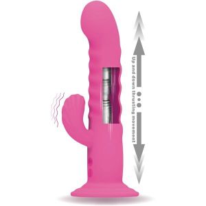 まず、このバイブはズンズンと突き上げるようなリニアピストン機能がついてるんだ!これによって、奥の奥まで響く快感が味わえちゃうんだよ! クリバイブもついていて、中から外から同時に刺激できちゃう!