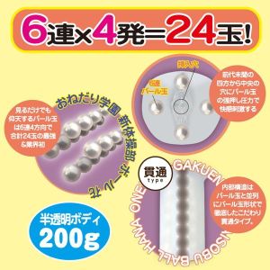 このボールの特徴は、なんと業界初の6連4発パール入りホールがあること。200gの大きさで、10mm玉パールがゴリゴリぐりぐり刺激しちゃいます♪これを使えば、自分で気持ちよくなれちゃうから、一人遊びにもぴったりだよ!また、このボールでオトナと一緒に遊んでも楽しめちゃうし、もっと深い快感が得られちゃうかも…!?