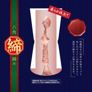 「八角締め」シリーズは、カップの形が八角形で凹んでるから持ちやすくて、中も凸凹で気持ちいいよ。色は青と赤があって、青は柔らかくて赤はちょっと硬めだよ。ローションも入ってるし、使い捨てじゃないから、大事に使ってね。