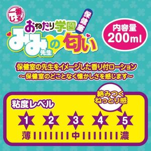 はいっ、お姉ちゃん、こんな変なものがあるんだよ〜。おねだり学園っていう学校の保健室の先生の匂いを再現したローションだって!なんか、ハッとしたことがあるかもしれないよ、絶対に!でもすごくフワフワで優しい香りがするね。使ってみると、先生のあそこのような本物の感覚が味わえるんだって♡涼しげなガラス瓶に入ってて、持ち運びにも便利だよ。一緒にピュアな夢を見ちゃおう〜!