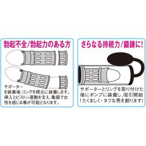 勃起不全や勃起力のある人は、サポーターとリングをつけると女性を感じることができるんだ。持続力や鍛錬もできるんだ!増大ポンプで吸引して、たくましく強くなっちゃおう!ローションもついているから、出かける前やデート前にサッと使えるよ!