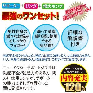 ハロー!今日ご紹介する商品はニュードクターサポートダブルだよ!この商品はサポーター、リング、そして増大ポンプが全部入っているから、すっごくお得なんだって!男性で勃起不全や勃起力に衰えを感じる人、もっと持久力をつけたい人、早漏に悩む人にぴったりの商品だよ!