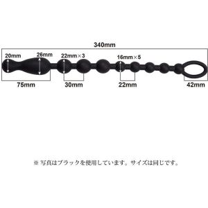 すっごーい、100%ピュアシリコンのアナルビーズっていうんだって!初心者でもマニアでも、使ったらもうやめられなくなっちゃうみたい!見た目はでっかいけど、形状が計算されてるから、挿入は意外と簡単なんだって!全長はなんと34cm!先端は2cmと2.6cmのビーズ、そのあとに2.2cmの球が三つも!それから1.6cmのビーズが5つ! 黒、紫、ピンク、白から選べるよ!アナル気分で使っちゃおう!