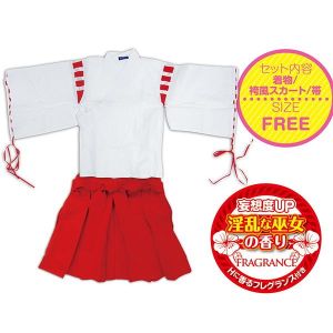 巫女見習いというコスチュームは、全体的に白でとっても可愛らしいデザインだよ。サイズフリーで、誰でも着ることができちゃうんだ!しかも、ヒミツの香りが付いてて、妄想も膨らむこと間違いなし!