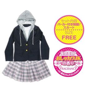 セットには、パーカー付き制服、スカート付き制服、ネクタイ、ハイソックス、パンティーがついてくるから、コーディネートもバッチリ!