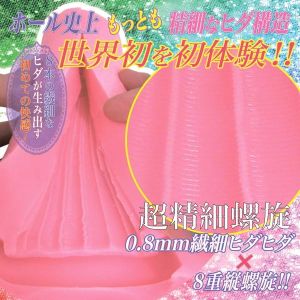 このグッズの特徴は、なんと8重螺旋の形になっているんだよ。これはなんと世界初なの!ヒダの構造もオナホ史上最も細かい0.8mmと、すごく細かくできているんだよ。だから、全長180mmにも関わらず、しっかりとゾリゾリ刺激できるんだ。