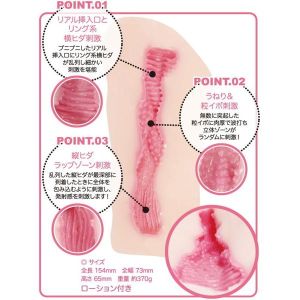 さてさて、特徴は、リアルな挿入口にリング系横ヒダ刺激、うねり&粒イボ刺激、縦ヒダラップゾーン刺激とトリプル刺激の肉厚非貫通ホールなんだって。すごく刺激的なんだ〜!肉厚で締め付けも強めで、吸いつきもすごくいいよ!握りやすくて使いやすいサイズなんだよ。それに、日本製でローションもついてるから使いやすさもバッチリだよん♪