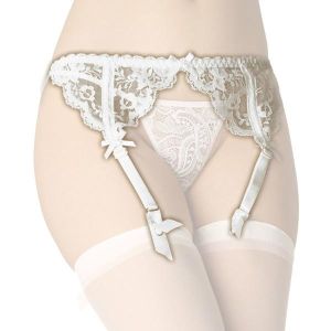あのね、このガーターベルトはレースで刺繍されてるんだって。すごく美しいし、手触りもしっとりしてて気持ちいいのよ。センターやベルトにはお花とリボンのワンポイントが付いてて、とってもキュート!それに、ショーツとストッキングは含まれてないのね。自分好みのものを合わせるのが楽しいかもしれないね。